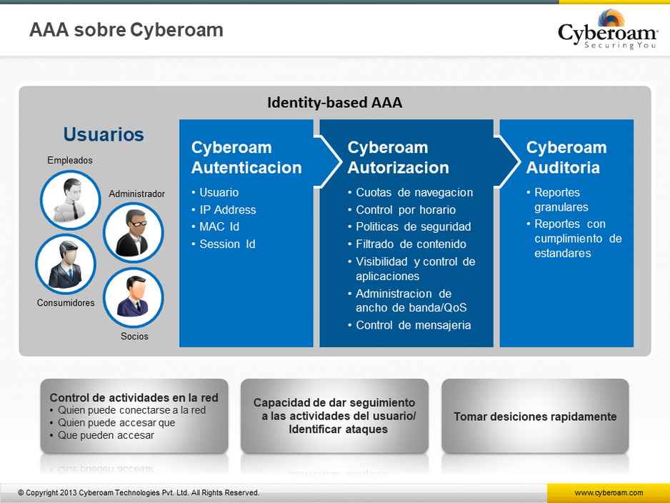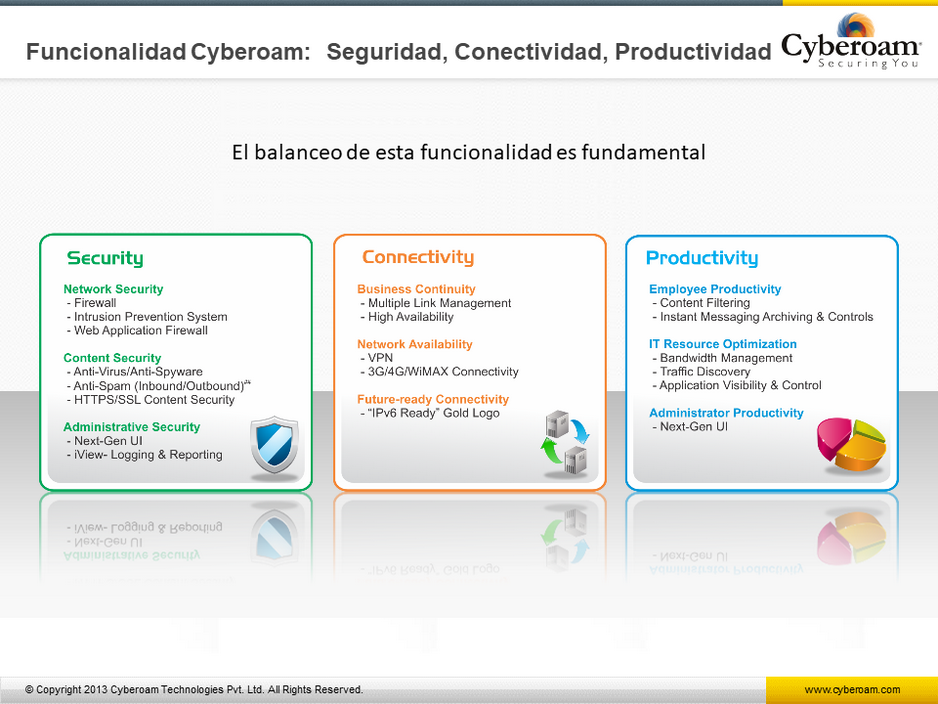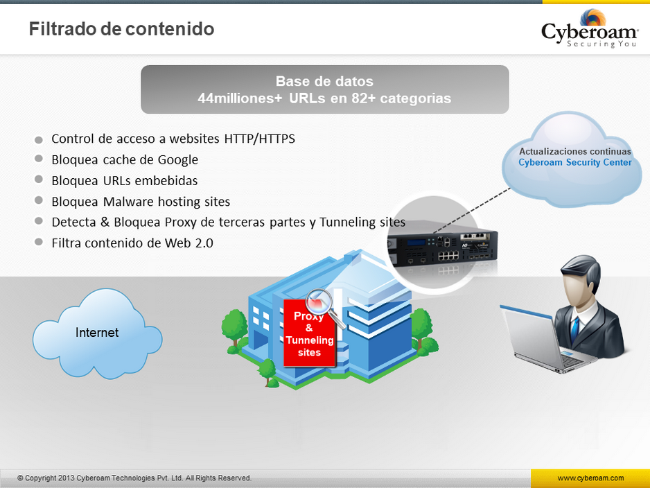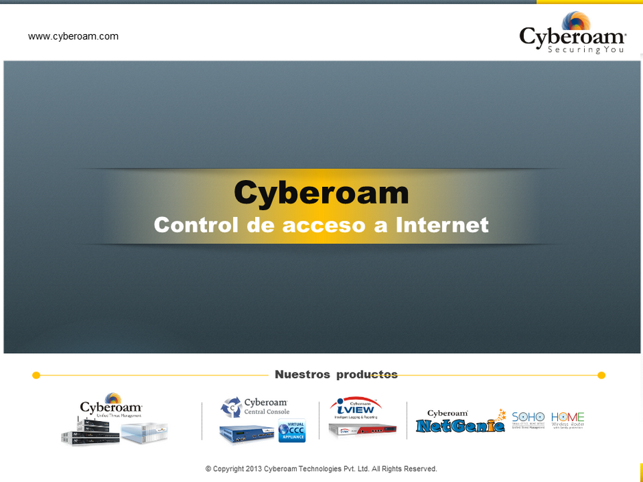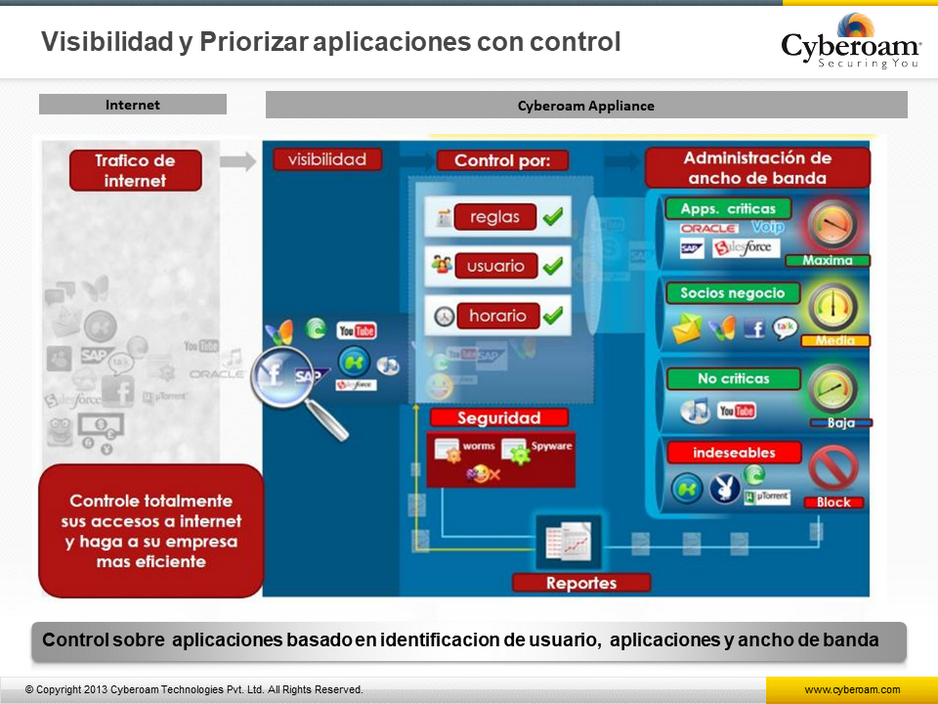 Cyberoam, es una solución que le ayuda a controlar el acceso a internet y al mismo tiempo le da seguridad Perimetral,cumple con los requerimientos de seguridad, conectividad y productividad de organizaciones con red, correo, web, aplicaciones y seguridad de de datos, acceso remoto seguro, reportes, conectividad a WAN contínua y administración de seguridad centralizada