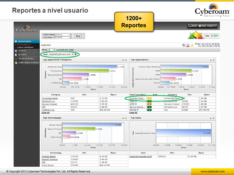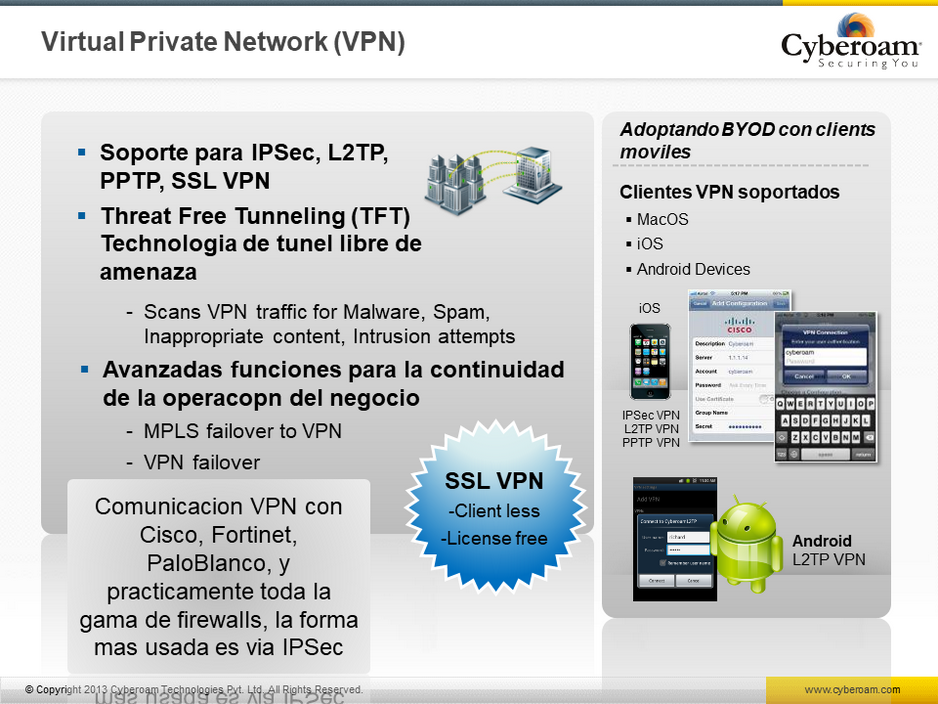 VPN –Cyberoam UTM ofrece VPNC-Certificado IPSec y SSL VPN a través de la aplicación UTM, asegurando una administración sencilla de acceso remoto seguro con alta flexibilidad mientras baja el costo de operación e instalación de los dispositivos.