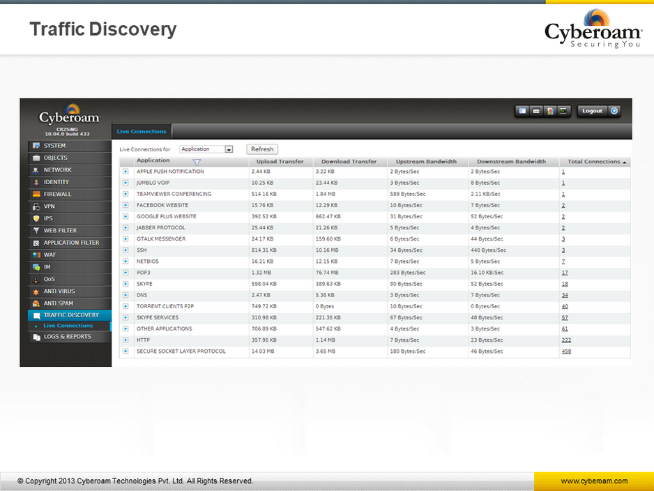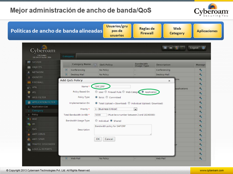 Cambie de Firewall a UTM –Cyberoam ofrece una Inspección de Firewall que esta integrada con VPN (IPSec y SSL), prevención de intrusos, antivirus, Anti-Spyware, Anti-Spam, Filtrado Web, Administración de Ancho de Banda, Administración de Enlaces Múltiples para ofrecer seguridad unificada.