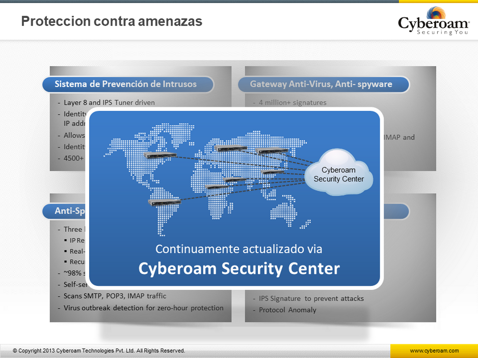 IPS –Cyberoam ofrece un avanzado Sistema de Prevención de Intrusos (IPS) administrando miles de firmas y políticas en capas de aplicaciones para automáticamente detectar y bloquear intrusos, Mensajería Instantánea y P2P, ataques Backdoors y otro malware. El IPS de Cyberoam administra firmas en HTTP Proxy, ofreciendo protección para cumplir los requerimientos únicos de cada organización.